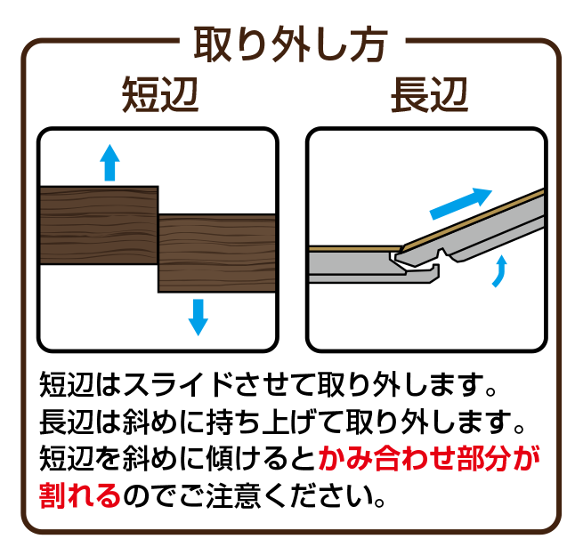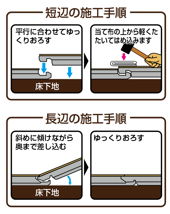 長辺と短辺をはめ込むことでかみ合わせて施工が可能です。接着剤や釘を使わない施工方法です。